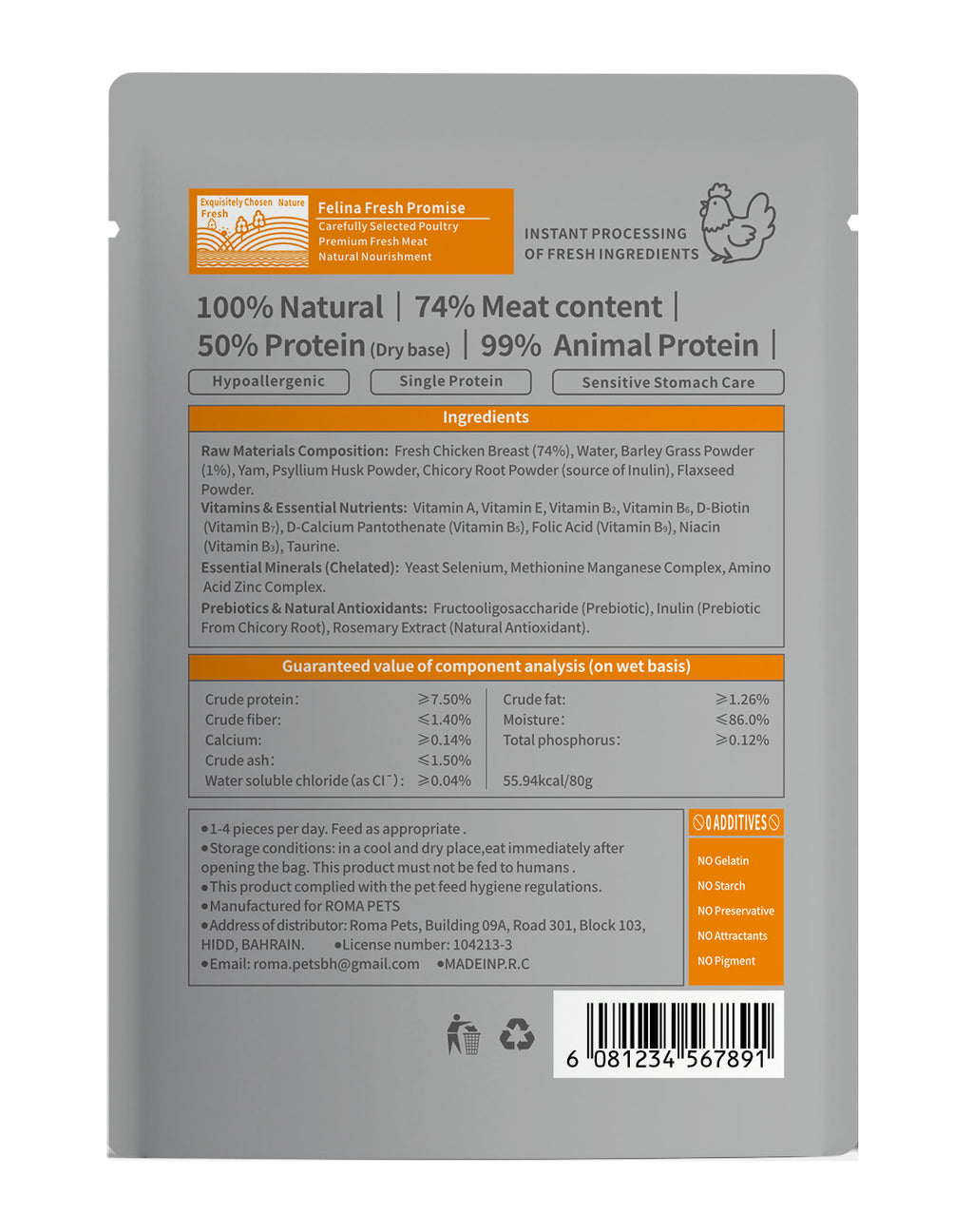 Felina chicken cat food Fresh Chicken with prebiotics and multivitamin formula, 80g, digestive care, suitable for all cat stages.Felina chicken Cat food Fresh Chicken packaging showing 100% natural ingredients,multivitamin formula 74% meat content,digestive care and nutritional details.Lab test report for Felina Fresh Meat cat food detailing nutritional analysis and specifications.